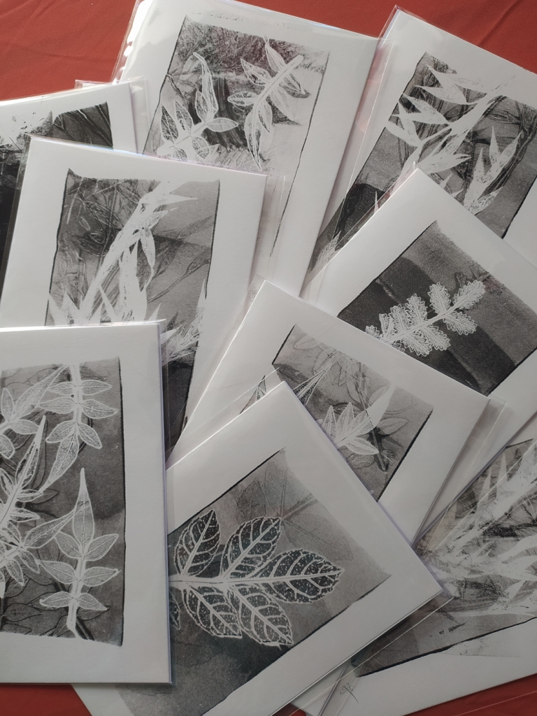J'ai créé ces estampes avec empreintes végétales, et leur ai associé 10 extraits de textes ou poèmes de :